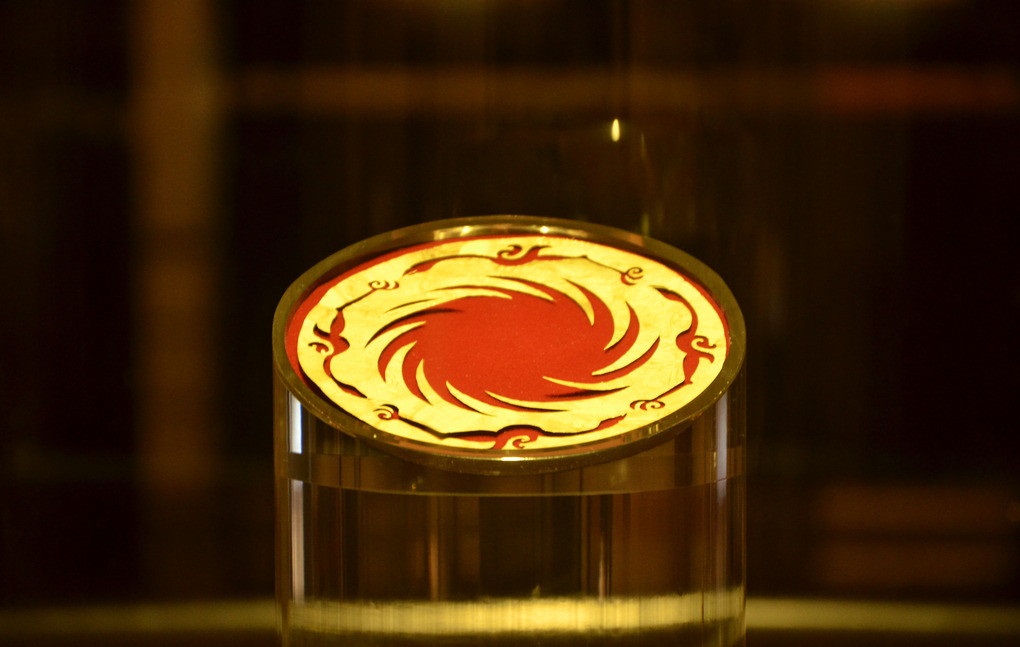 “太阳神鸟”本来是一件出土于成都金沙遗址的金饰,此展品为商周时期的金器,呈圆形,器身极薄。现收藏于成都金沙遗址博物馆。